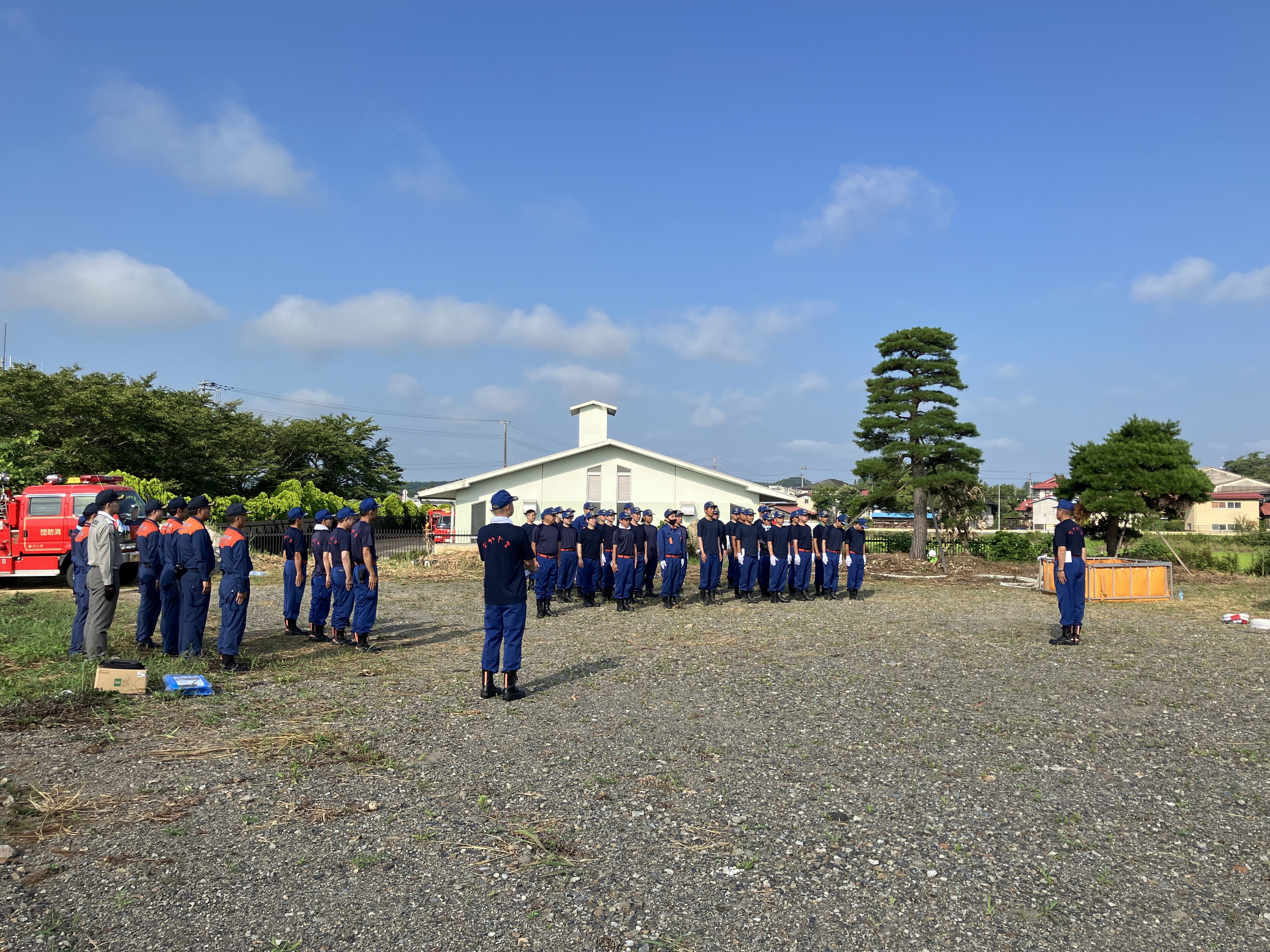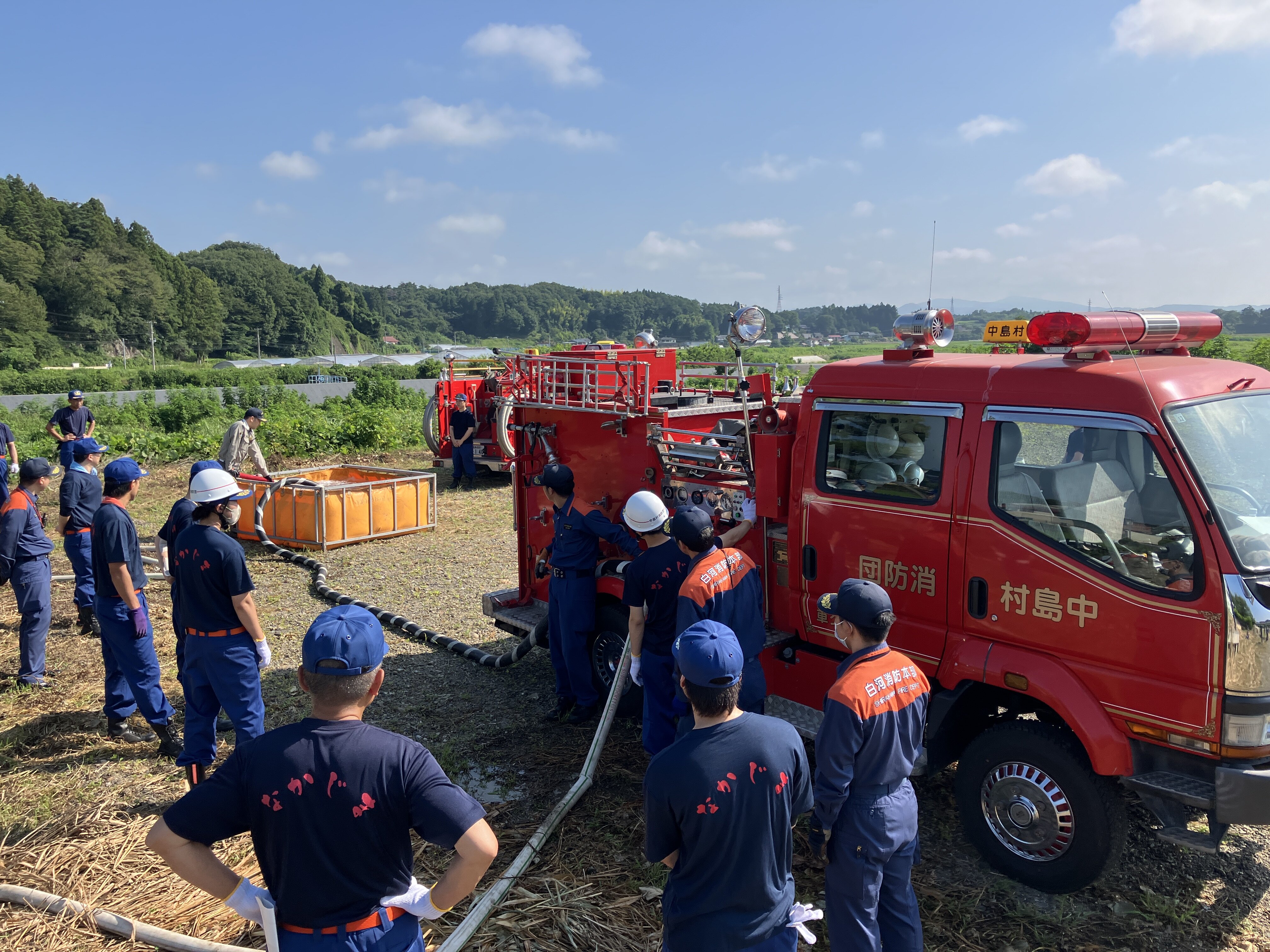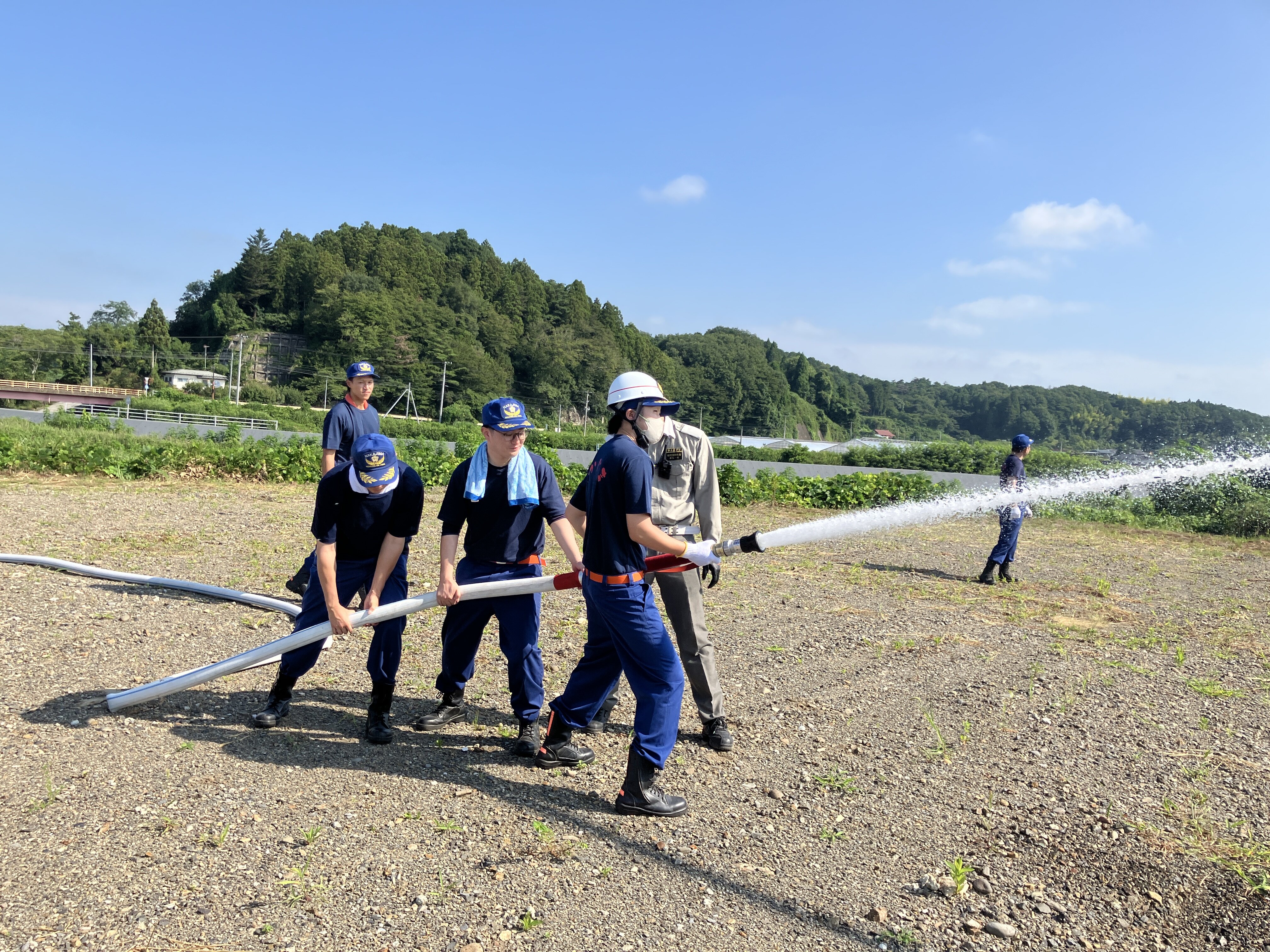 また、大雨により水が溜まった場所が発生した想定のもと、消防団のポンプ車を使用し排水を行う訓練も実施されました。適切なポンプ運用により、迅速に揚水、送水がなされておりました。