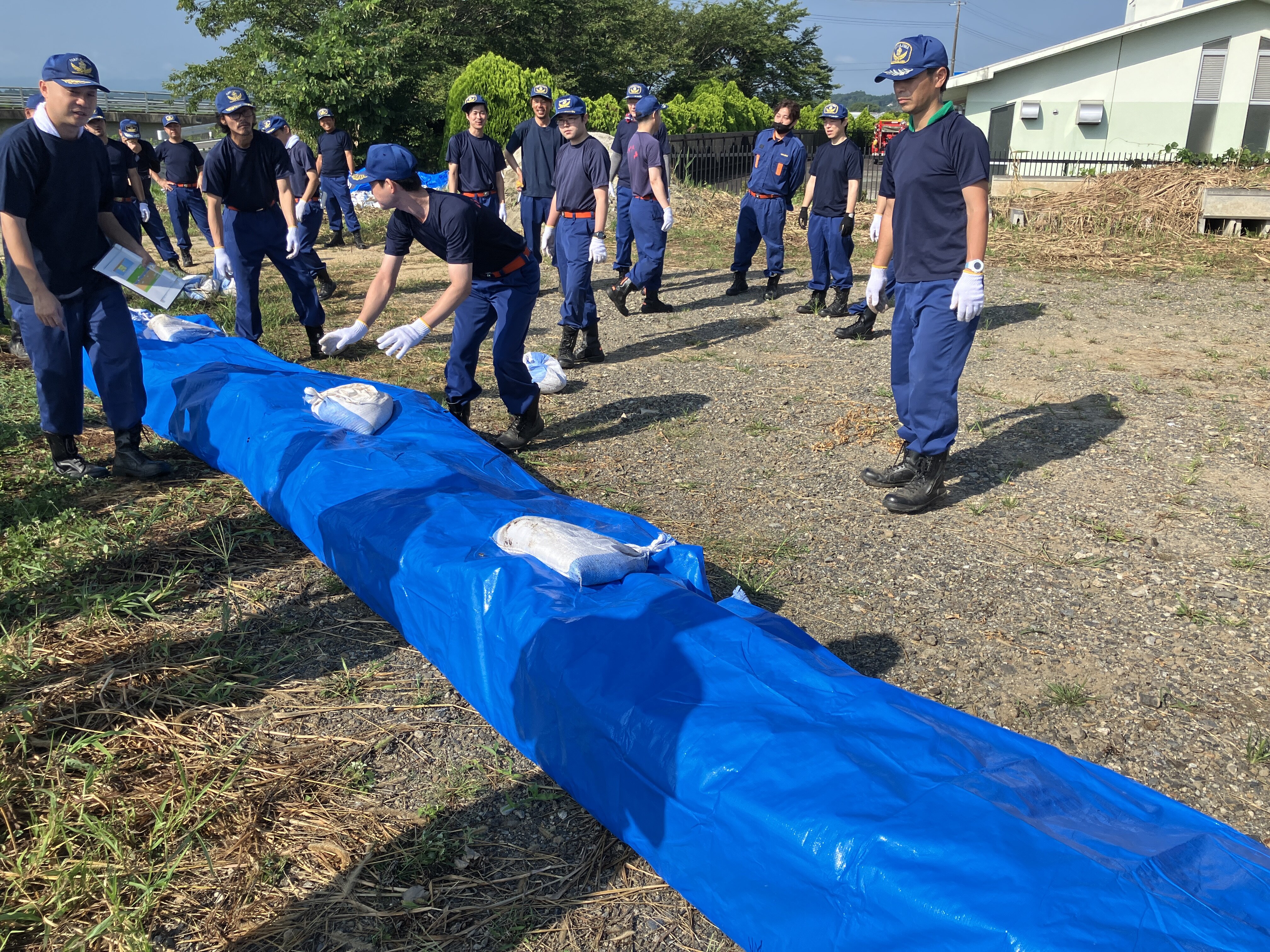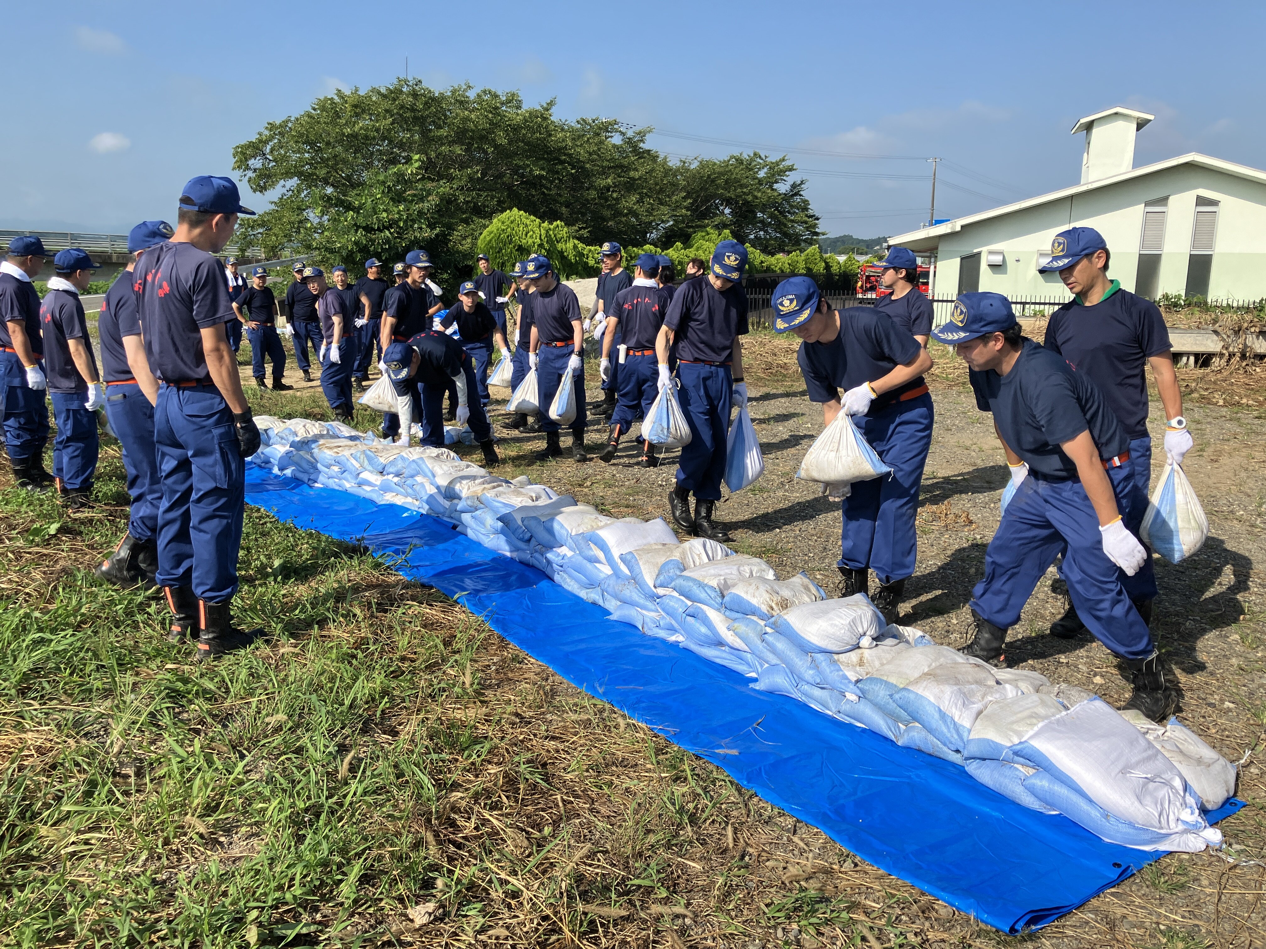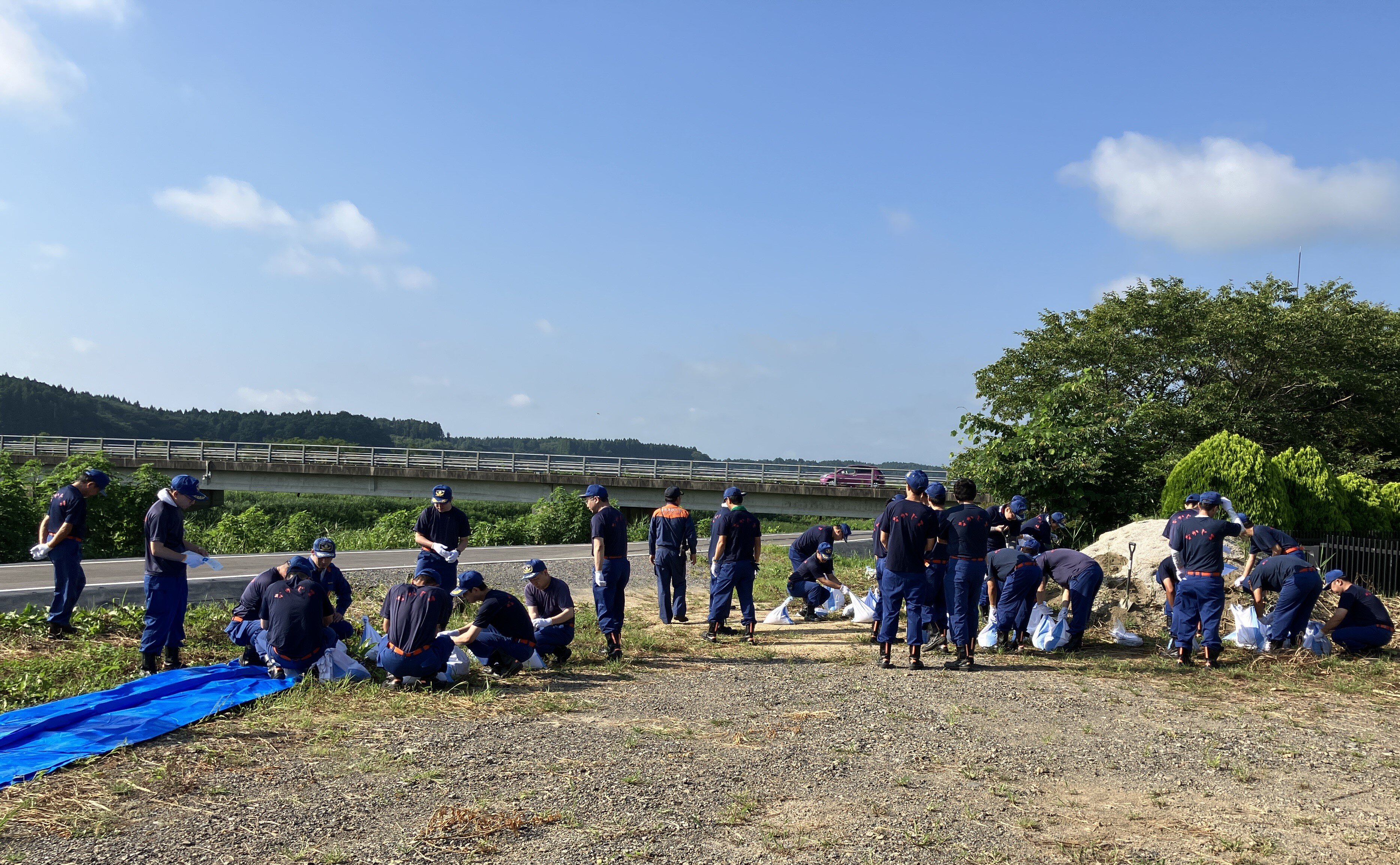 近年、全国各地で大雨により浸水などの被害が多発しています。中島村には一級河川の阿武隈川(長さ239kmで全国6位)があり、過去には大雨により越水したこともあります。今回の訓練は、村内の浸水被害が予想される地域において、土のうを作成・使用した水防工法で浸水被害の軽減、防除する目的のもと実施されました。中島村消防団員が連携し、土のう作成、運搬、積み上げを実施し実りのある訓練となりました。