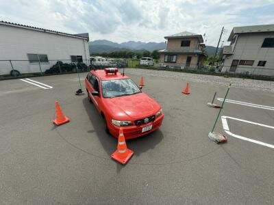 パイロン(コーン)を使って狭いコースを作り、車両の感覚やミラーの使い方、ハンドル操作、誘導の仕方などを確認しながら練習しました。隊員同士で声をかけ合い、安全に動けるように工夫しながら取り組みました。