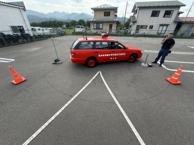 この訓練は、狭い道や住宅地など、スペースが限られた場所で安全に車を動かすための運転練習です。実際の火災や救急の現場では、大きな消防車や救急車を細い路地に入れる必要があるため、日ごろからこうした訓練を行うことが大切です。